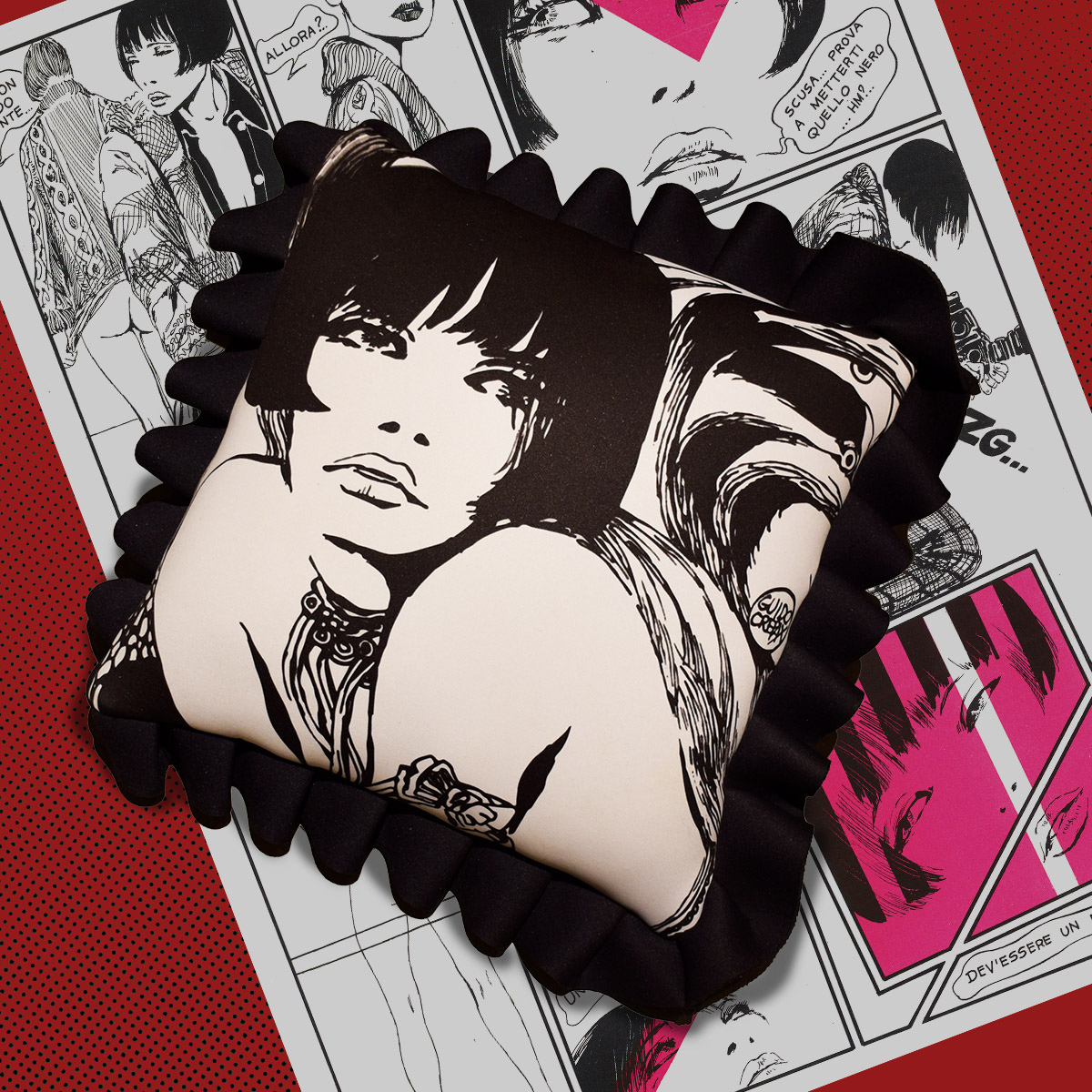 Cushion made of neoprene, waterproof with enlargement of Valentina’s character taken from a vintage Milano Libri poster.