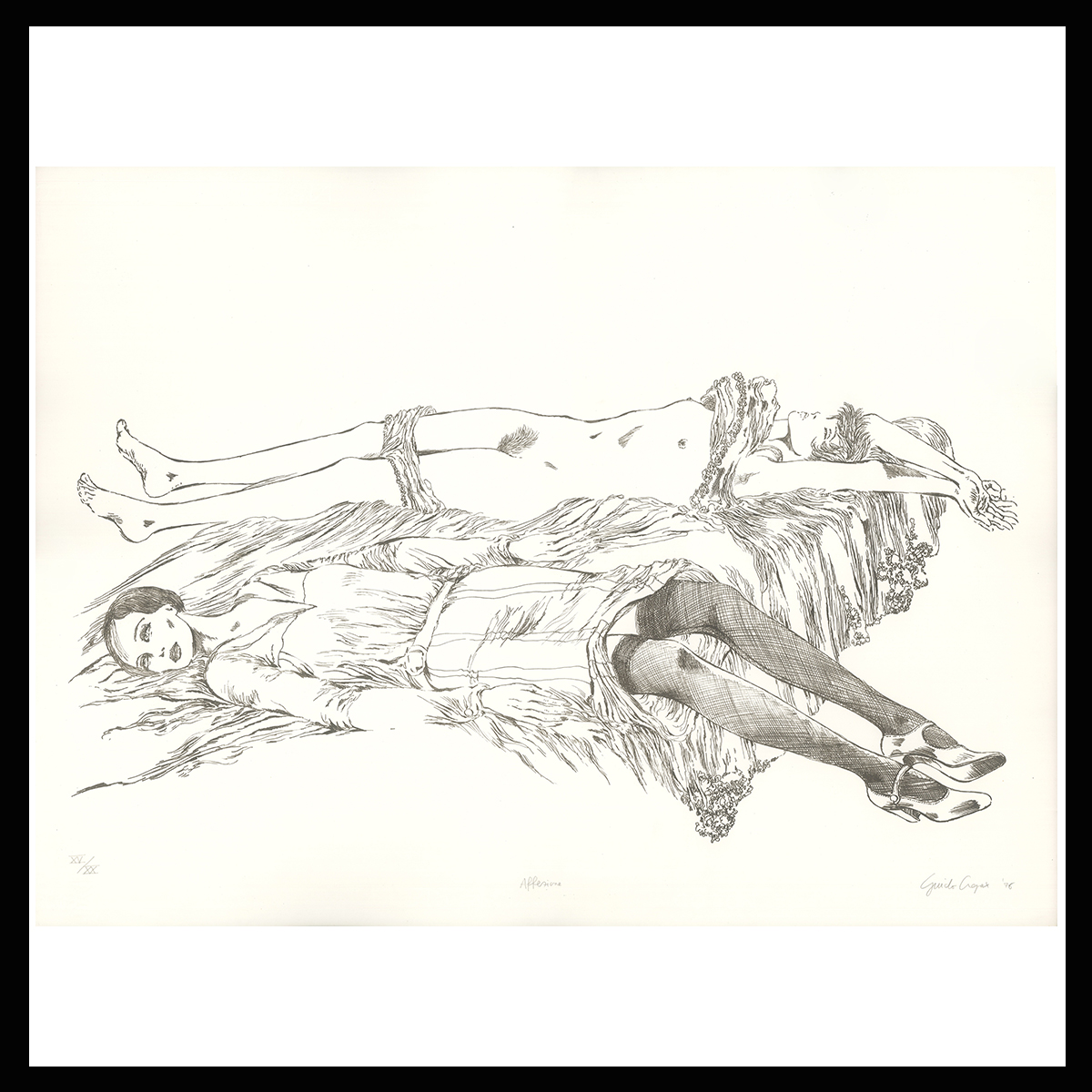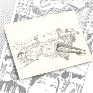 Litografia in bianco e nero su carta Fabriano, numerata e firmata da Guido Crepax, Edizione galleria L’Angolare tratta da un’illustrazione presente del libro “Affezioni” di Franco Maria Ricci, 1976, rilasciato con certificato di Autenticità da Archivio Crepax.