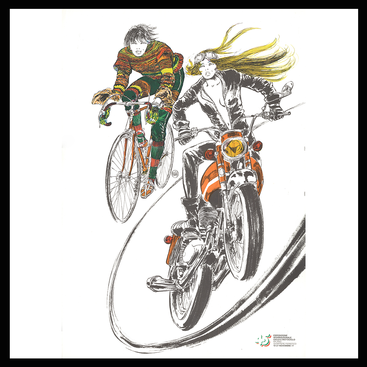 Poster vintage per la “45° Esposizione Internazionale del Ciclo e Motociclo”, quartiere fieristico di Milano, 1977, rilasciato con timbro a secco di autenticità da Archivio Crepax.