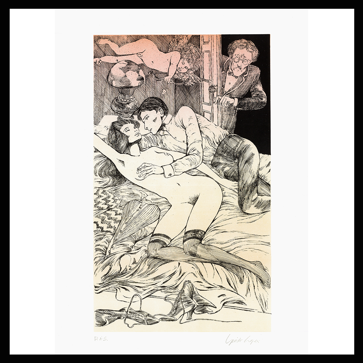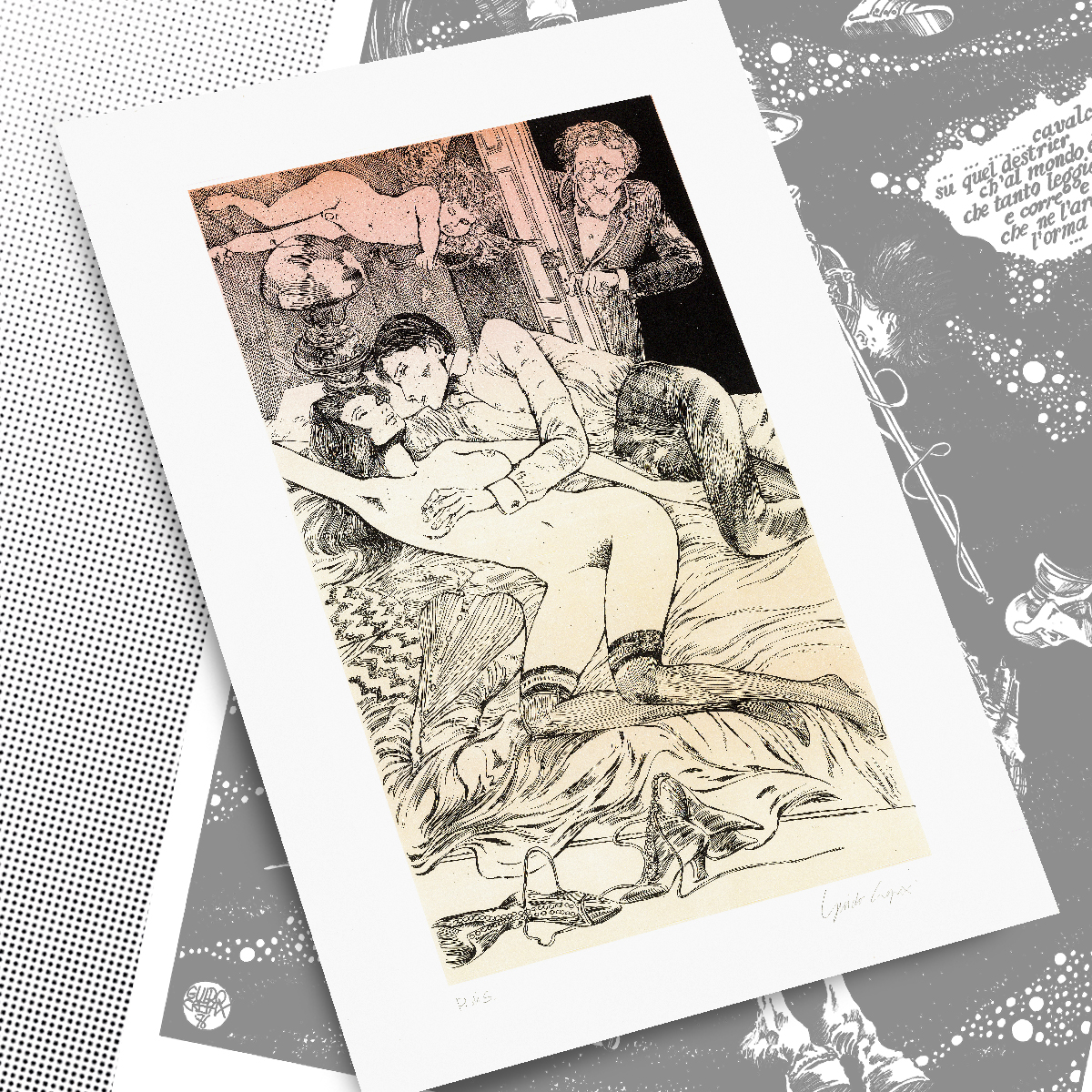 Litografia a tre colori su carta Fabriano, la carta degli “Amanti” è una di dodici incisioni eseguita per Editrice S’alvure sul tema dei tarocchi, firmata da Guido Crepax, 1994, rilasciato con certificato di Autenticità da Archivio Crepax.