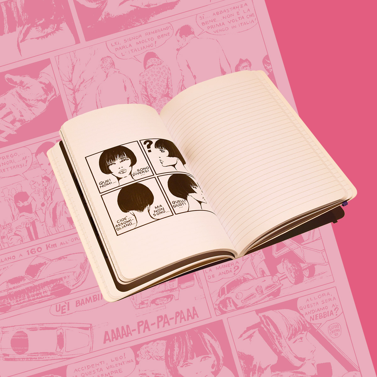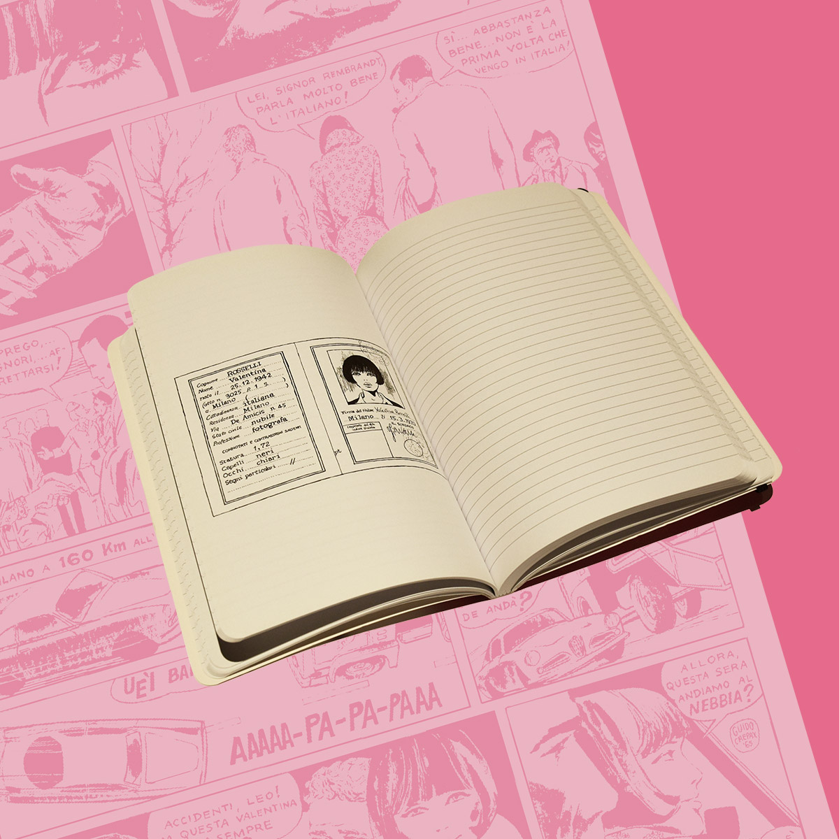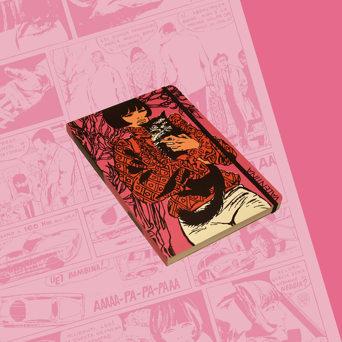 Taccuino a righe prodotto nel 2012. La copertina riprende i colori di una vecchia edizione di quaderni creata dal Maestro Guido Crepax, alcune delle pagine interne contengono estratti dalle storie di Valentina.