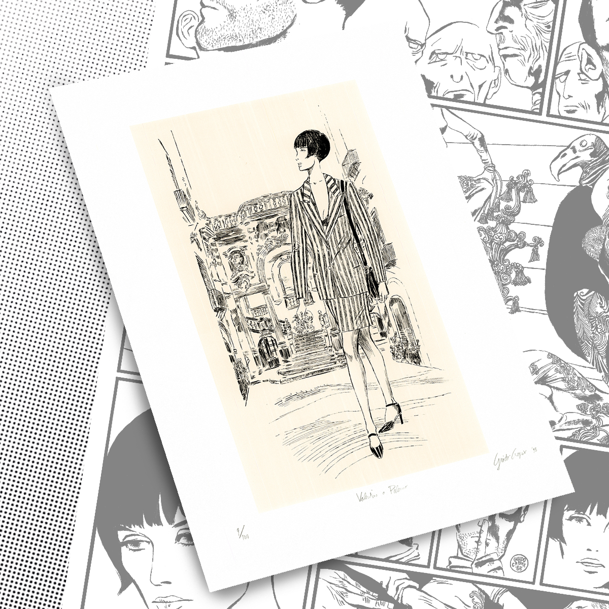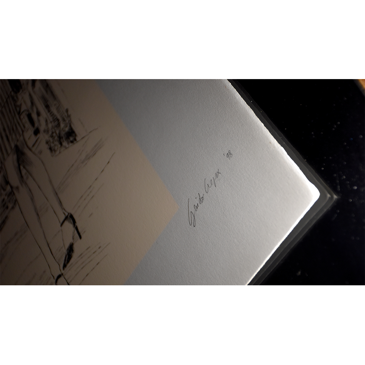 Litografia in banco e nero su carta a mano  su sfondo ocra, numerata e firmata da Guido Crepax, disegnato in omaggio alla città di Palermo, 1998, rilasciato con certificato di Autenticità da Archivio Crepax.