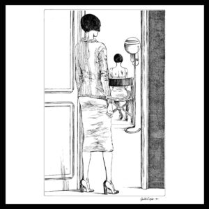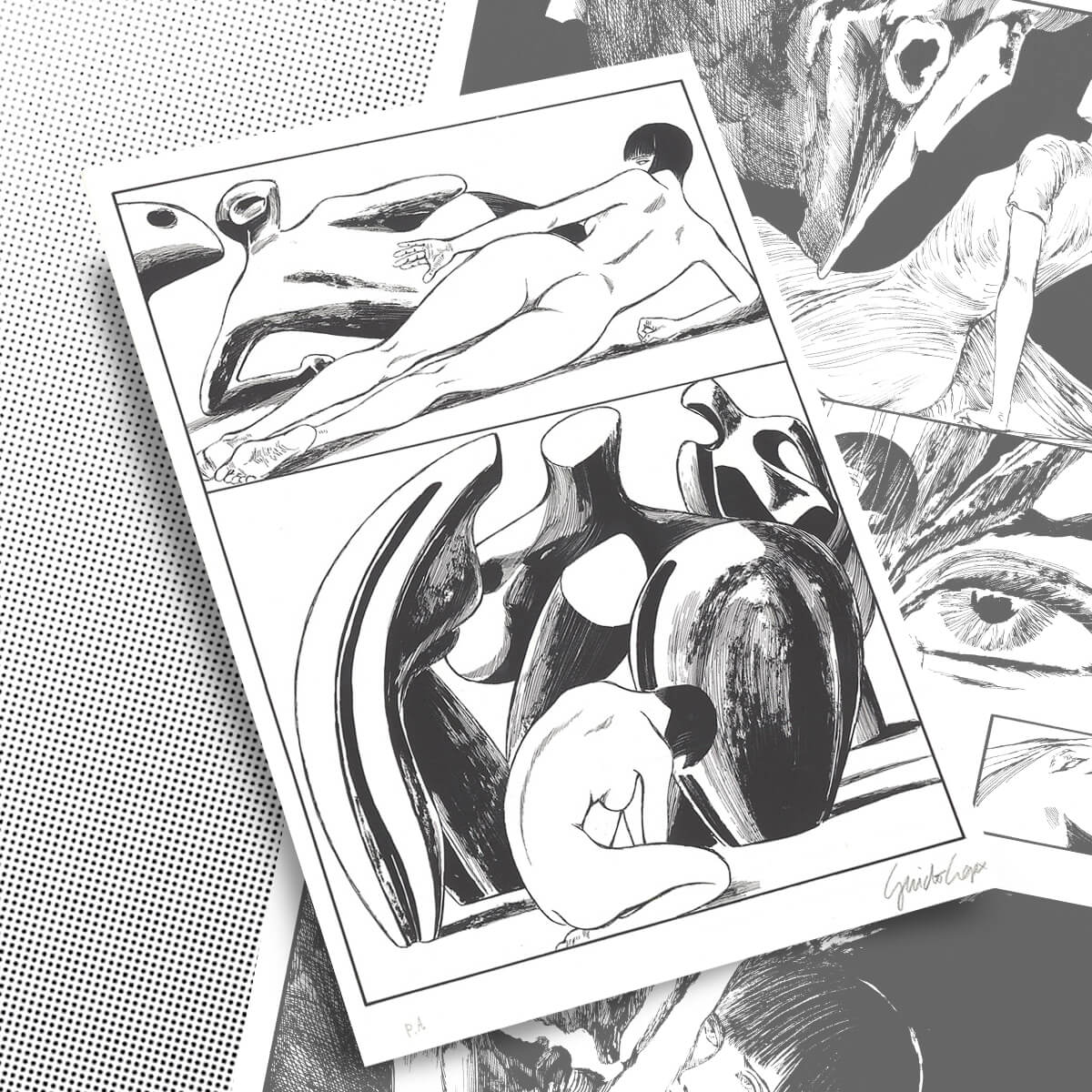 Litografia in bianco e nero firmata da Guido Crepax, stampata assieme a sei tavole, tratta da “Valentina sindrome di Moore” per la mostra alla Galleria l’Agrifoglio, 1991, rilasciato con certificato di Autenticità da Archivio Crepax.