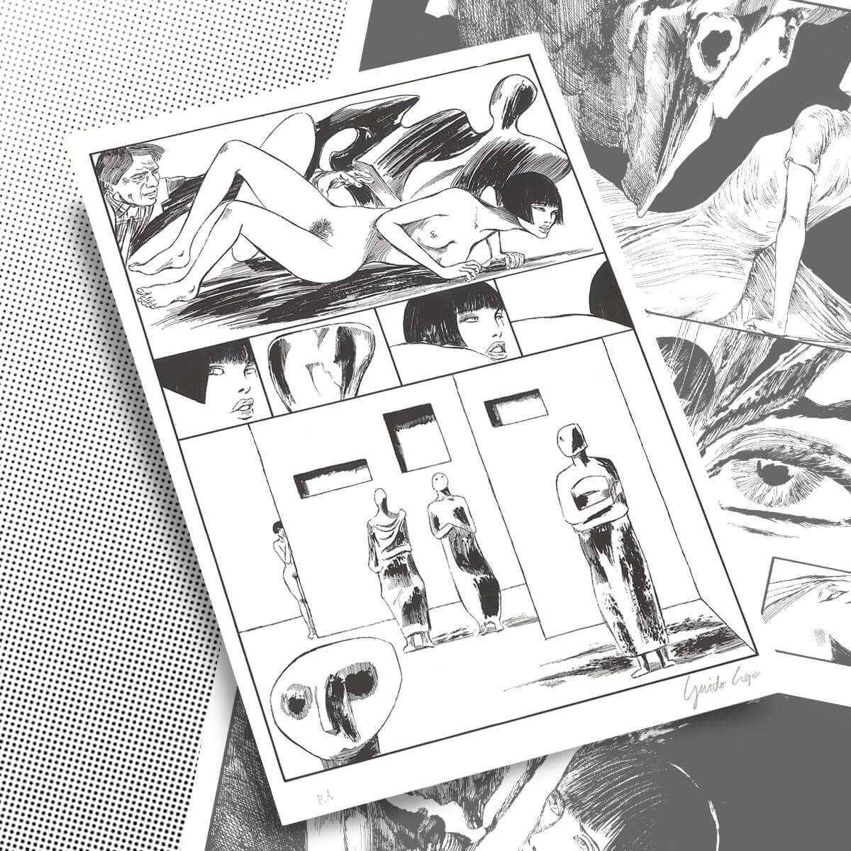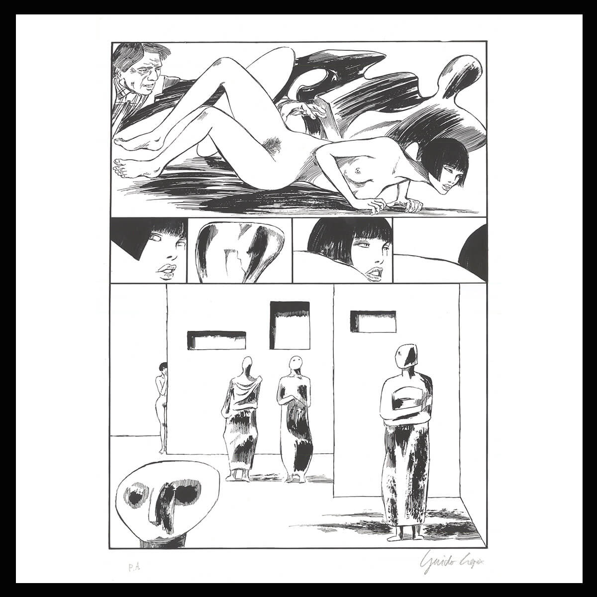 Litografia in bianco e nero firmata da Guido Crepax, stampata assieme a sei tavole, tratta da “Valentina sindrome di Moore” per la mostra alla Galleria l’Agrifoglio, 1991, rilasciato con certificato di Autenticità da Archivio Crepax.