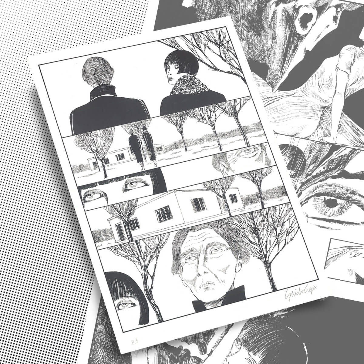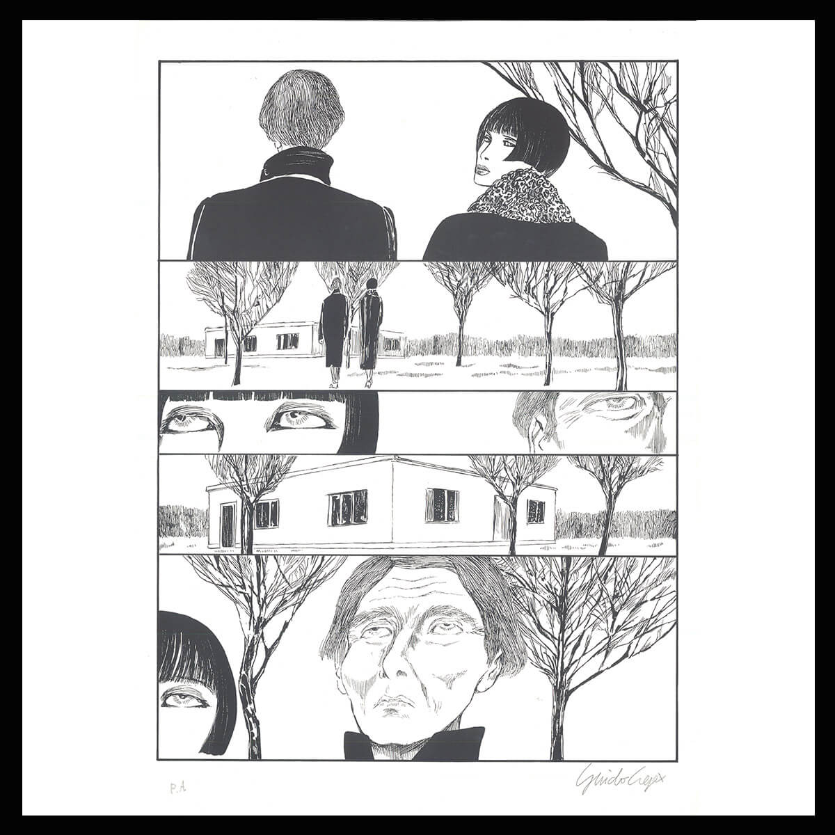 Litografia in bianco e nero firmata da Guido Crepax, stampata assieme a sei tavole, tratta da “Valentina sindrome di Moore” per la mostra alla Galleria l’Agrifoglio, 1991, rilasciato con certificato di Autenticità da Archivio Crepax.