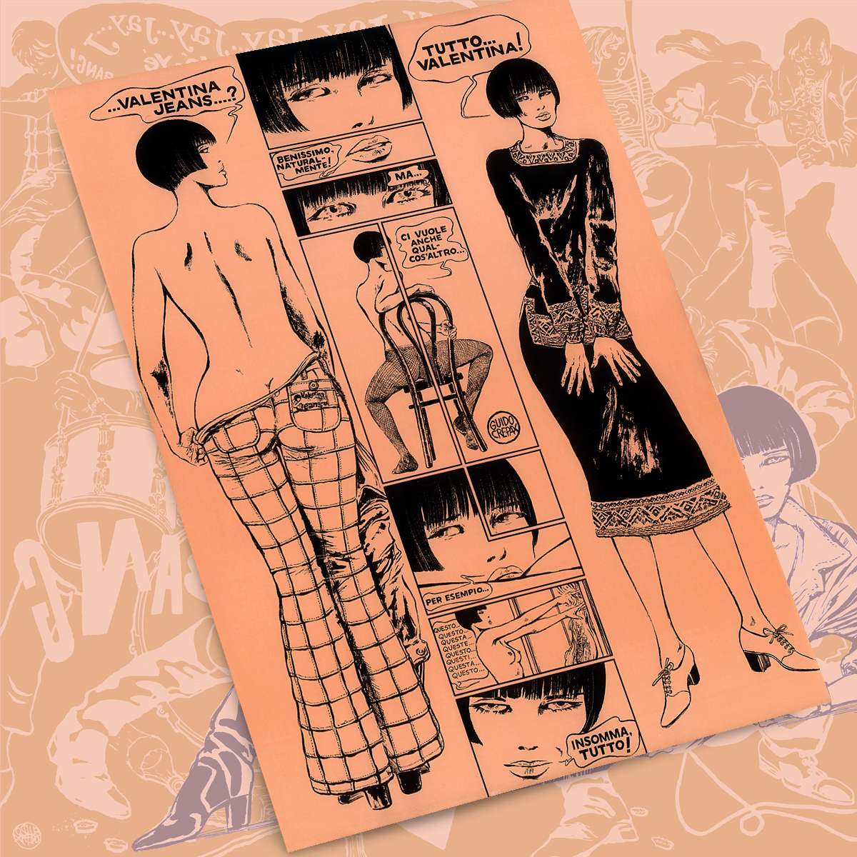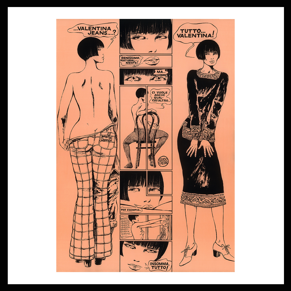 Poster pubblicitario vintage per la collezione anni ’70 “Valentina Jeans”, rilasciato con timbro a secco di autenticità da Archivio Crepax.